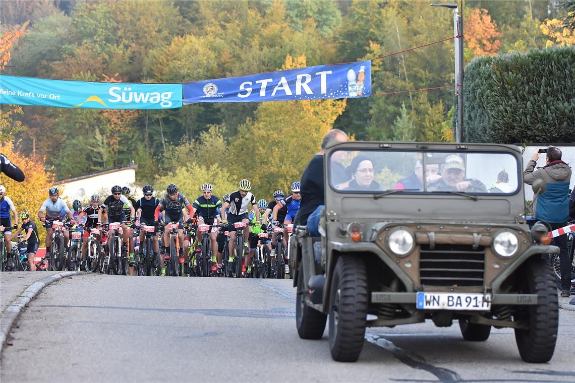 Damit das Rennen reibungslos über die Bühne geht, hatten die Organisatoren rund 200 Helfer im Einsatz. Eine Neuerung gab es beim Start, der in drei Blöcken erfolgte. Der Transponder für die Zeitmessung ist in der Startnummer integriert und damit ein exaktes Erfassen der Rennzeiten gewährleistet. Mit einem sogenannten neutralisierten Start geht es dann auf die Strecke. Das heißt, um die Sturzgefahr zu reduzieren, fahren die Sportler nicht aus dem Stand mit Höchstgeschwindigkeit los, sondern rollen mit gemäßigtem Tempo hinter dem Wagen von Walter Bauer her. Erst wenn er die Rennstrecke verlässt, kommt es zum scharfen Start. Und der Wagen allein ist schon ein Hingucker. „Es ist ein Ford Muth aus dem Jahr 1964, ein US-Jeep, wie er von den Amerikanern in Vietnam eingesetzt wurde“, erläutert Bauer nicht ganz ohne Stolz.