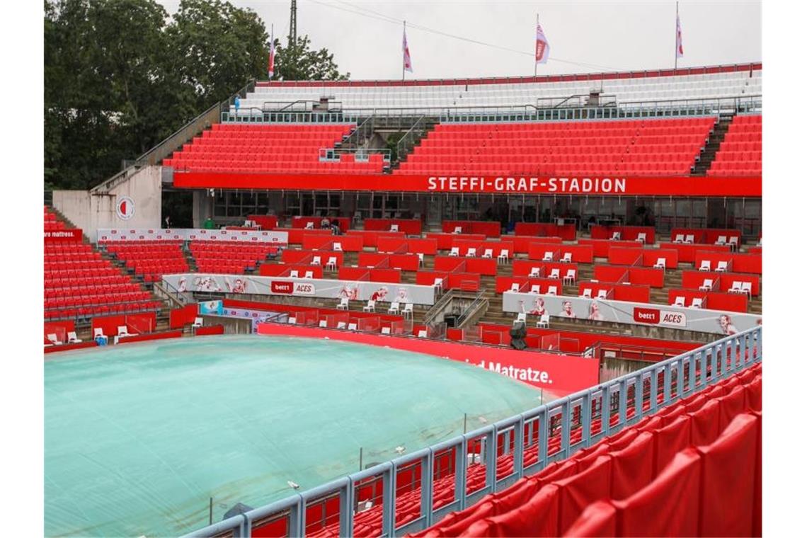 Regen in Berlin sorgte für eine Plane über dem Platz des Steffi-Graf-Stadions. Foto: Andreas Gora/dpa