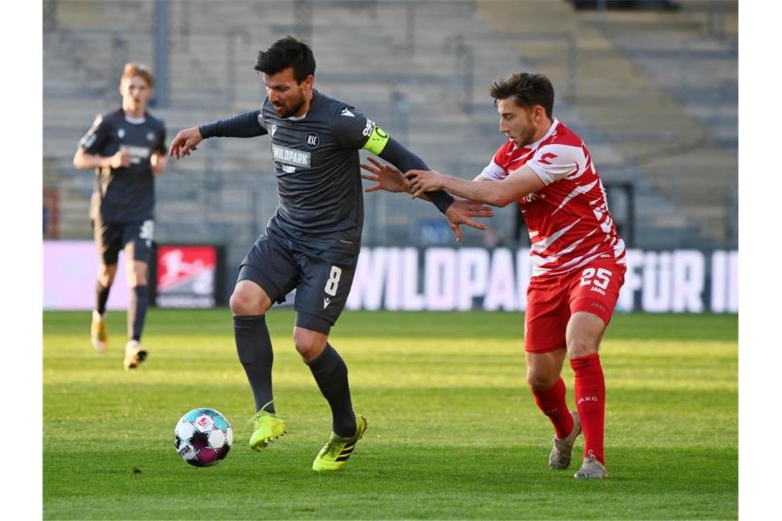 KSC-Profi Jérôme Gondorf (l) schirmt den Ball gegen den Würzburger Dominik Meisel ab. Foto: Uli Deck/dpa