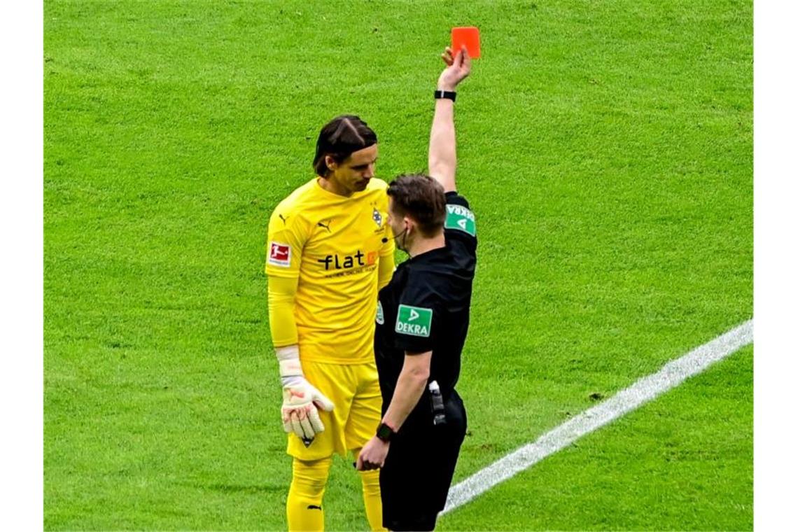 Schiedsrichter Patrick Ittrich zeigt Mönchengladbachs Torwart Yann Sommer im Spiel gegen Hertha die Rote Karte. Foto: Tobias Schwarz/AFP POOL/dpa