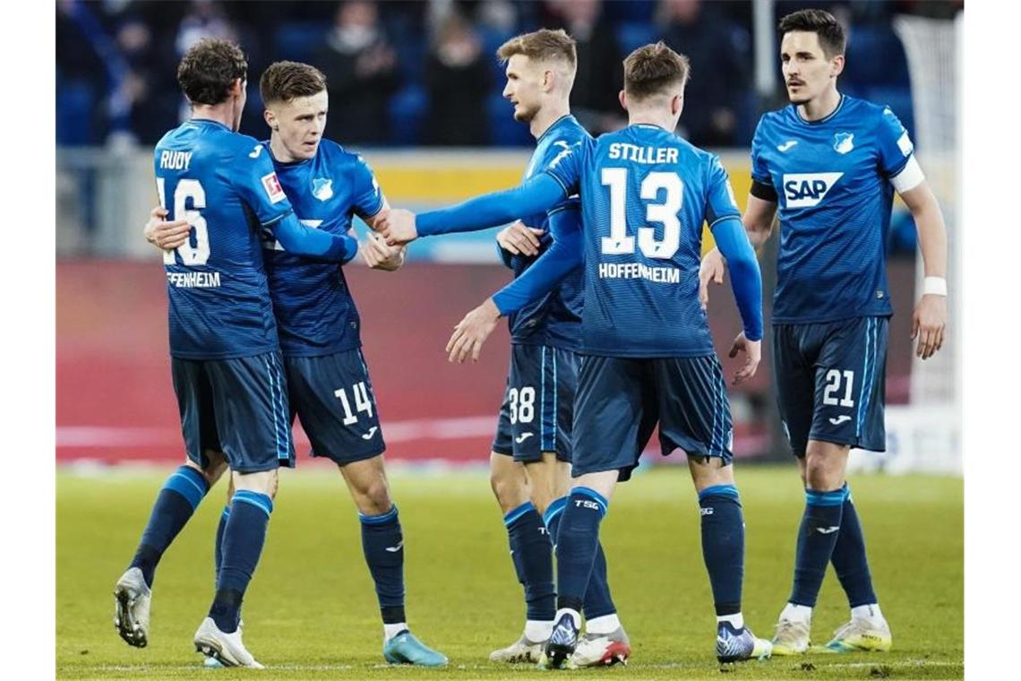 Hoffenheims Torschütze Christoph Baumgartner (2.v.l) jubelt mit Mannschaftskollegen über das Tor zum 1:1. Foto: Uwe Anspach/dpa