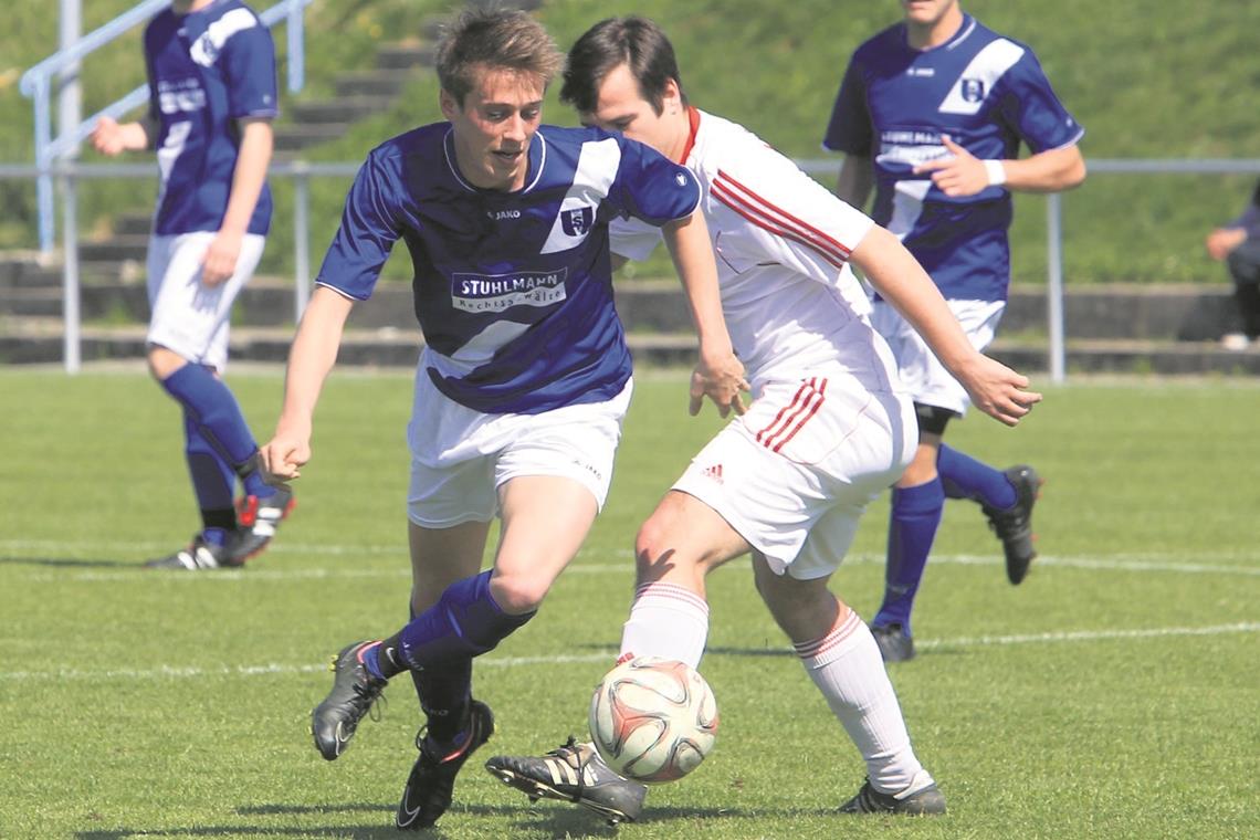 Setzte sich in Kaisersbach zweimal entscheidend durch und schoss den SVU in der letzten Minute der Verlängerung ins Halbfinale: Denis Leon Krug (links), der beim Weissacher 2:1 beide Treffer erzielte. Foto: B. Strohmaier